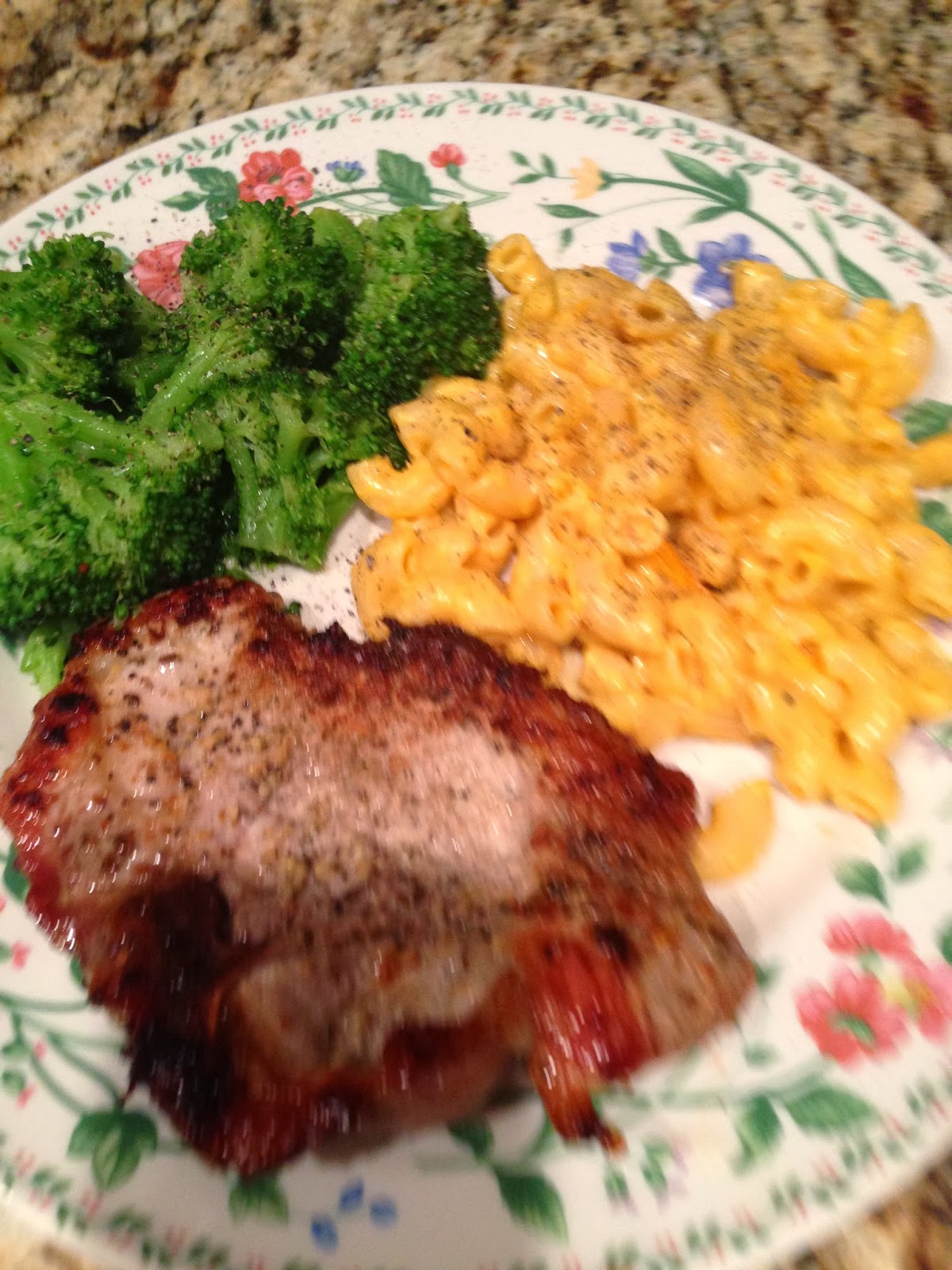 Pork chop, macaroni and cheese, broccoli and salad on the side :)